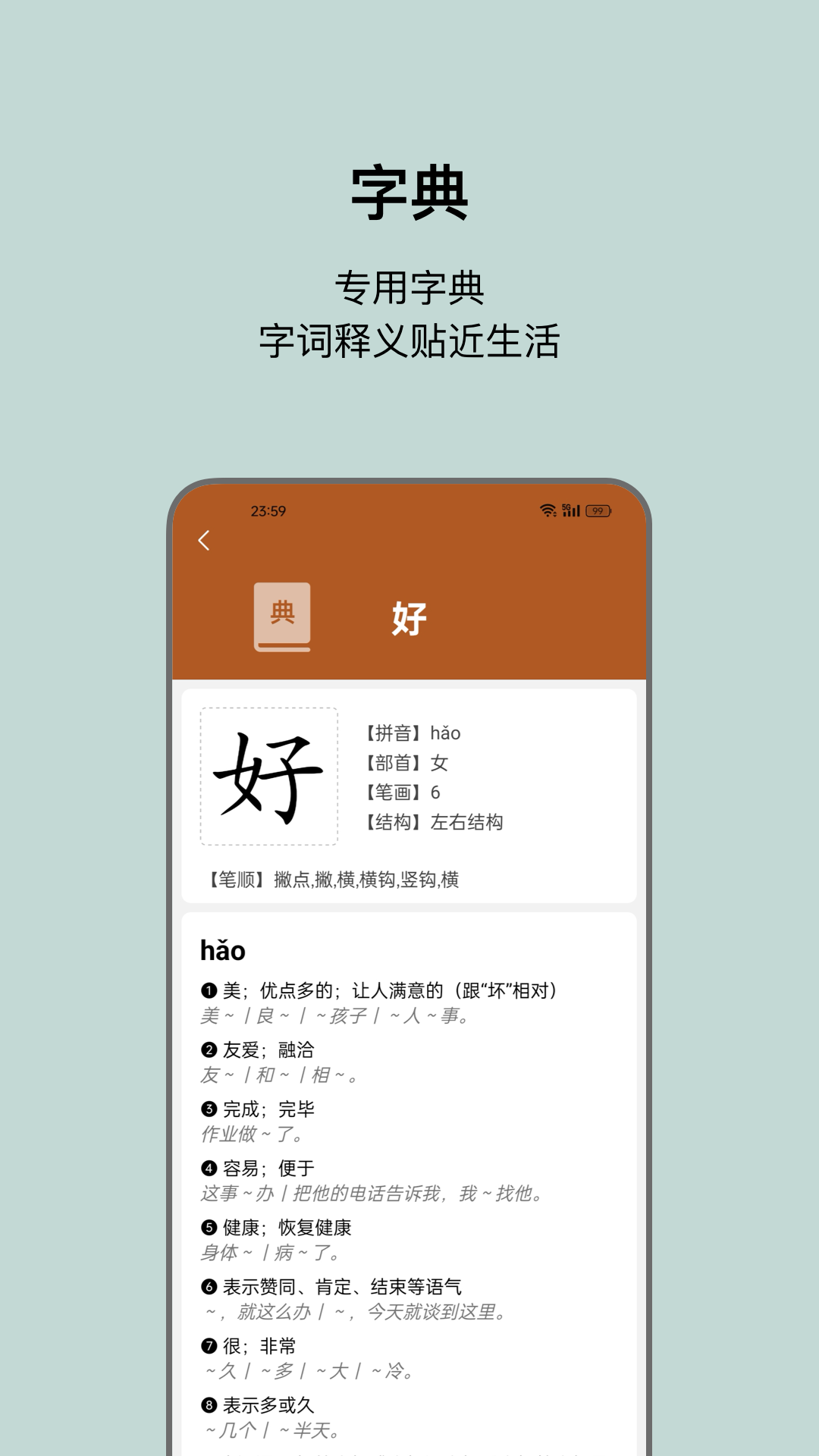 它巧妙融合了趣味性与教育性,让孩子在轻松愉快的氛围中高效学习汉字。丰富的学习资源、多样的学习方式,充分满足不同孩子的兴趣和需求。个性化的学习路径设计和细致的学习数据分析,帮助家长全面了解孩子的学习状态,从而提供更有针对性的辅导。软件的安全保障与稳定运行,也令用户更加信赖。不论是家长在家辅导,还是孩子自主探索,这款软件都能为汉字学习打下坚实的基础,是家长和孩子共同提升的理想选择。
