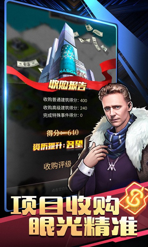 在这款游戏中,你扮演一位失业后毅然创业的奋斗者,从零开始拥有第一笔启动资金,通过开设各类店铺、招揽优秀人才、进行商业谈判逐步扩大你的产业版图。核心玩法涵盖了门店经营、房地产投资、商战对抗和人才招募等多方面系统,例如经营奶茶店、超市、SPA馆等十余种不同类型的店铺,每种店铺都需匹配特定的人才以提升利润;同时在房地产市场中参与炒房大战,赢取海景别墅。你还能与全国各地的商业大佬展开智力较量,争夺市场份额。游戏中特别设计了挂机收益机制,即便离线,财富也能持续累积,通过策略逐步获得豪车、跑车及环球精英职位。