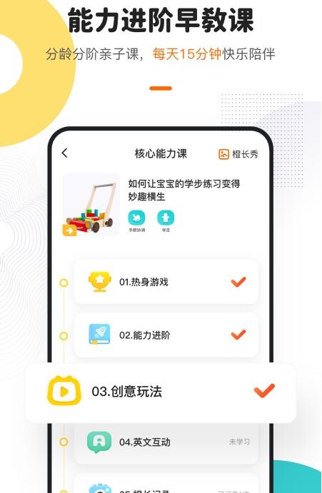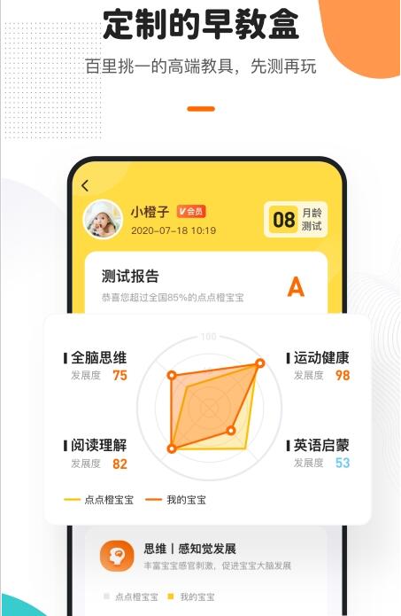 点点橙是一款专为2至4岁幼儿量身定制的启蒙早教软件,宛如一位细心呵护的育儿助手,借助大数据分析,为每个宝宝量身设计最适合的学习体验。借助动画、趣味游戏及互动课程,让宝贝在快乐中学习,渐渐爱上探索与发现。它不仅帮助孩子在黄金启蒙期全面提升认知能力、健康素养及社交技巧,还能让父母在家轻松实现科学育儿,省心省力,事半功倍。