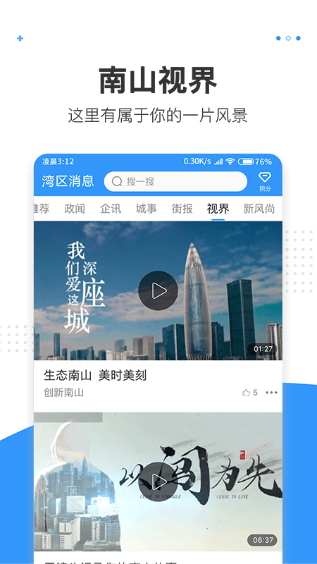 此平台最具特色之处在于将新闻资讯、政务服务以及生活便民功能巧妙融合。一打开APP,便可看到经过精心分类的政务资讯、视界以及新风尚等多样板块,既有官方权威的政务信息发布,又有展现城市风采的影像内容,以及弘扬正能量、践行文明的实践活动。值得一提的是,它集成了i深圳、南山博物馆等常用服务平台,用户可以轻松借阅图书、预约文体活动等。对于热衷公益的居民,内置的新时代文明实践中心入口支持快速注册成为志愿者,活动信息清晰明了,积分体系亦激励积极参与。此外,积分商城设计别出心裁:浏览新闻、点赞分享都能积攒积分,用于兑换文创礼品,让阅读变得更加趣味盎然。