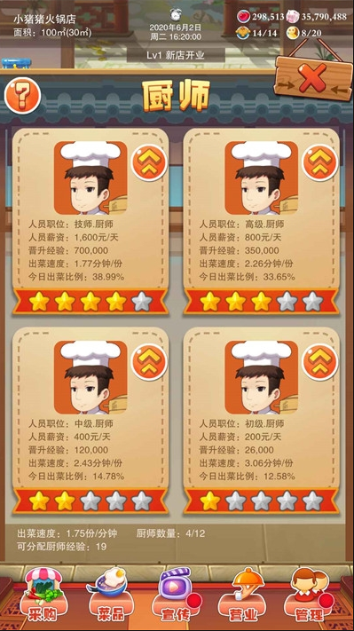 游戏的起始条件是每个店铺面积为50平方米,能够容纳10张餐桌,当客流量超出预期时,玩家需考虑扩大店面规模。但需要注意的是,店铺租金是持续支出,盲目扩张可能导致经济压力过大,建议根据每日实际客流合理制定租赁计划,否则容易陷入亏损甚至倒闭。在宣传策略方面,游戏提供六种不同的推广模式,每种方式对应不同的获客成本,作为店主应结合店铺的客单价选择最优的宣传方案。厨师负责菜品制作,若发现出菜速度缓慢,可考虑增加厨师人数或提升现有厨师的技能;而服务员则负责点餐与清洁工作,根据实际运营需求调整人员布局,以确保服务质量和效率。