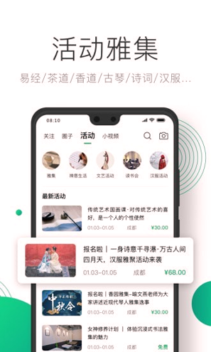 一打开这款应用,就仿佛步入一座充满东方美学气息的文化馆。首页会智能推送附近的各类课程和活动,比如周末的茶道交流会或书法体验班。在“觅课堂”板块,覆盖国学经典、古筝入门等二十多个学习领域,由名师录制的视频教学内容随心观看。尤为喜欢它的雅集功能,只需轻点几下即可报名诗词赏析会、汉服游园会等特色文化活动,还能结识志趣相投的朋友。在市集部分,藏有许多文化精品:手工茶具、非遗刺绣等,每件商品都配有详细的文化背景介绍,无论自用还是送礼都彰显品味。