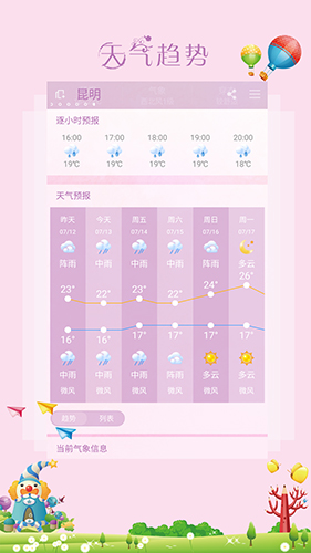 这款软件的最大亮点在于其细节设计满满,特别贴合女性用户的需要。背景界面根据天气变化动态切换:下雨时有水滴效果,晴天则洒落暖阳,连图标都萌趣十足。功能方面,除基础天气信息外,还支持添加多个城市,一键切换出差或旅游地点极为方便。预警通知设置到位,遇到台风或寒潮等极端天气时,会第一时间弹出安全防护指南,比如关好门窗、避免户外危险,给用户带来极佳的安全感。更难得的是全无广告干扰,界面简洁清爽,像被雨水洗净一样纯净舒适!