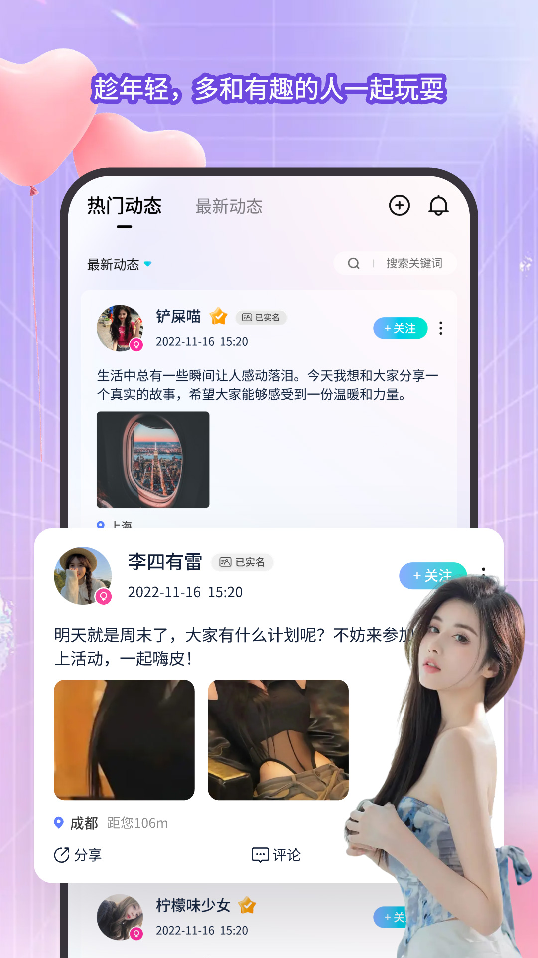 该款应用的特色之一在于其智能匹配系统及丰富的社区互动。依托先进的算法技术,能够精准将你引入兴趣圈子,结识志同道合的伙伴,不再局限于熟悉的好友圈。社区功能涵盖语音、视频聊天,只需轻点几下,即可快速结交新朋友、互动娱乐。平台实行严格的实名认证程序,确保每位用户都是真人身份,保障使用安全。邻里交友板块帮助用户寻找灵魂伴侣或结识有缘的陌生人,通过朋友圈动态可以了解对方的近期状态,拉近关系,快速摆脱单身困境,开启美好人际关系新篇章。