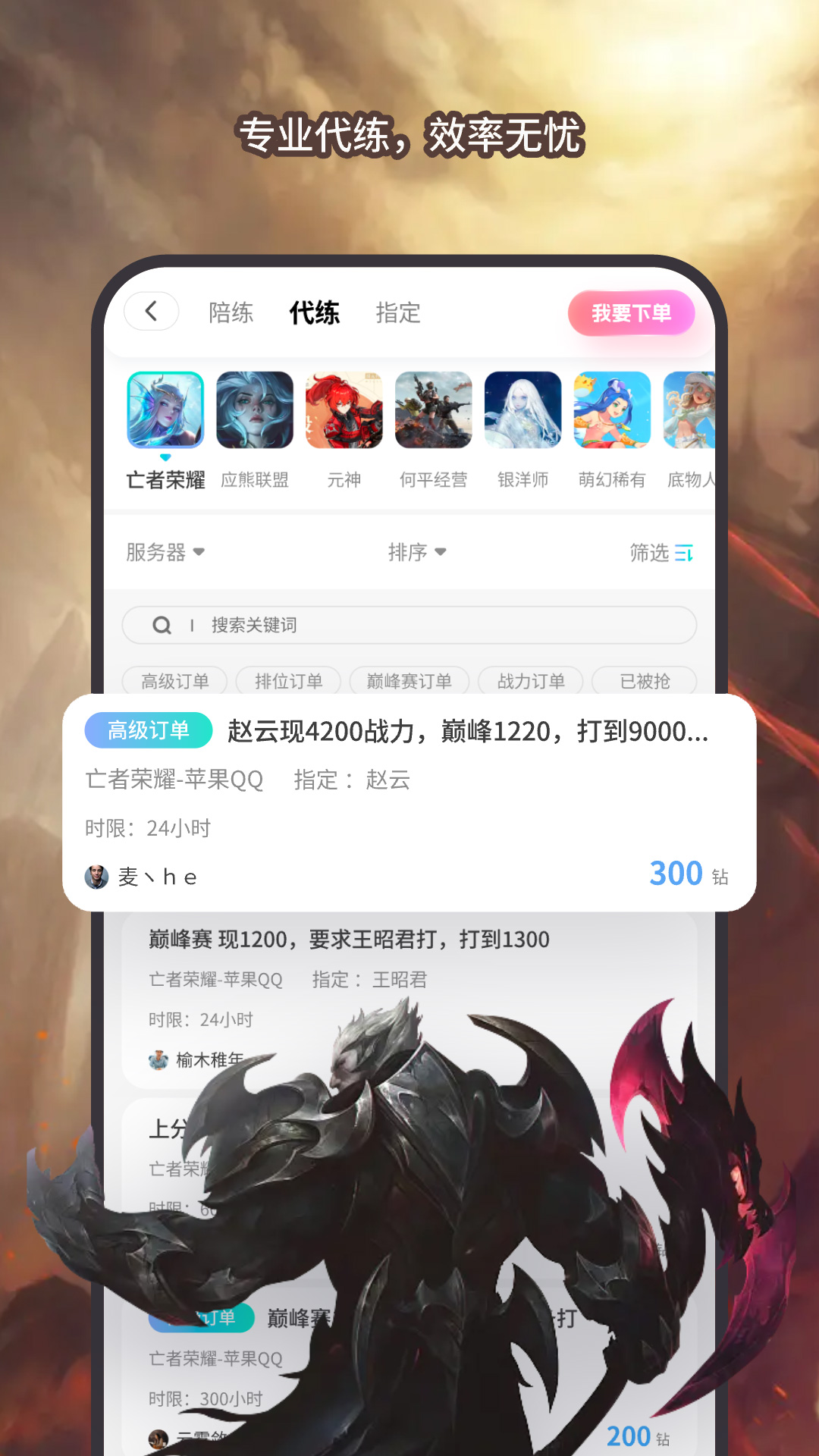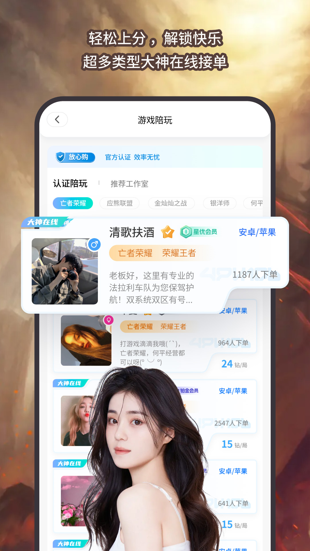 这款软件的核心功能极为全面,其一是提供专业的游戏账号代练服务。由官方认证的实力团队操作,确保用户能够体验到高效快速的段位提升,无论你是新手还是经验丰富的老玩家,都能获取最适合的代练匹配。平台对每位代练人员的资质进行严格审核,确保交易的安全和可靠。同时,用户可以随时通过详细的进度追踪和反馈机制,掌握代练的进展情况。除了代练外,还具备游戏陪玩功能,旨在帮助玩家找到志趣相投的队友,共享游戏乐趣。智能匹配算法会根据你的游戏习惯、偏好以及实时需求,精准推荐最合适的陪玩伙伴。无论是单排还是组队,都能避免孤单感,让每次游戏都充满合作的快乐。陪玩服务不仅提供技术上的支持,更注重情感上的陪伴,使每场游戏体验都充满温馨与趣味。对于想出售或购买游戏账号的用户,平台的账号交易功能也是极佳的选择。拥有丰富的优质账号库,从新手号到高等级账号应有尽有。卖家可以一键发布闲置账号,资金秒到账,极大简化了变现流程;买家则可以详细查看账号信息,包括装备、等级、成就等关键数据,保证交易的透明与安全。平台承诺终生包赔,出现任何问题会第一时间介入处理,维护用户权益。