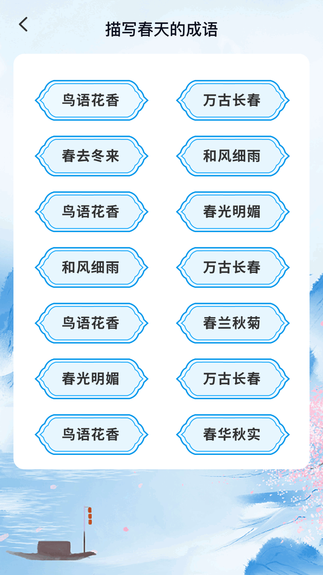 3. 学习模式:支持多元化的学习方式,包括填空题、选择题、成语配对等,促使用户通过反复练习巩固记忆,深化理解。