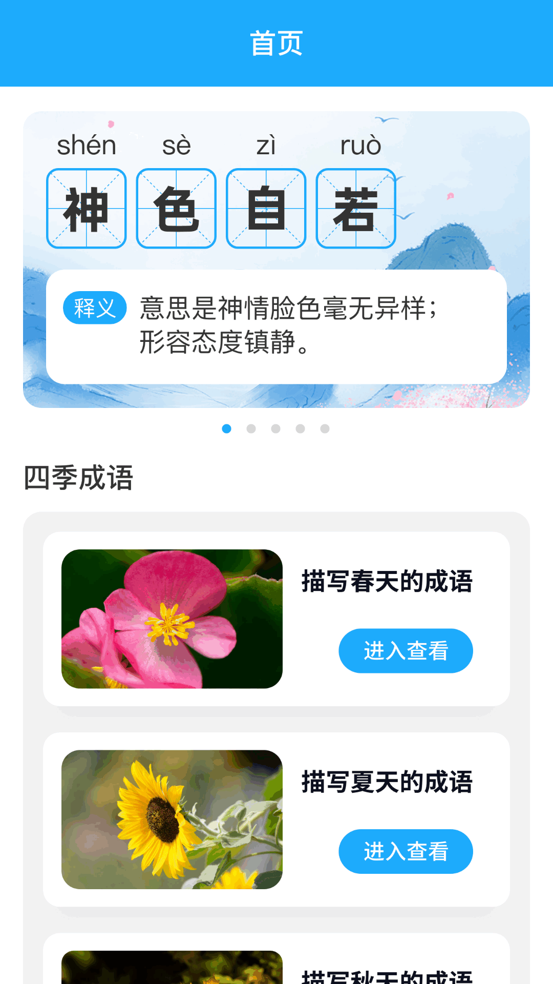 2. 成语故事:每个成语配备生动有趣的背景故事,帮助用户在理解的基础上更深入地记忆与领会。