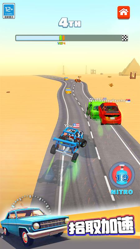 本作的核心玩法主要划分为:合成升级、竞速对战以及赛季挑战三大部分。起初,玩家只拥有基础型号的车辆,必须通过参加比赛赚取金币和获取赛车部件,然后将两辆相同等级的车辆合成升级为性能更强的高阶车型,从而改善加速、操控等关键指标。游戏中的赛道类型丰富,包括繁华的都市街区、荒凉的沙漠戈壁、极地冰雪场等十余种地形,还配备动态天气系统,如雨天打滑、沙尘阻碍等物理效果,这些都显著影响驾驶策略。多人在线模式中,最多支持8人同时竞速,玩家可以利用氮气加速及干扰道具在激烈角逐中实现策略性的超越;而单人模式则包括主线任务和限时挑战,完成任务即可解锁隐藏配件和稀有涂装,丰富游戏内容。