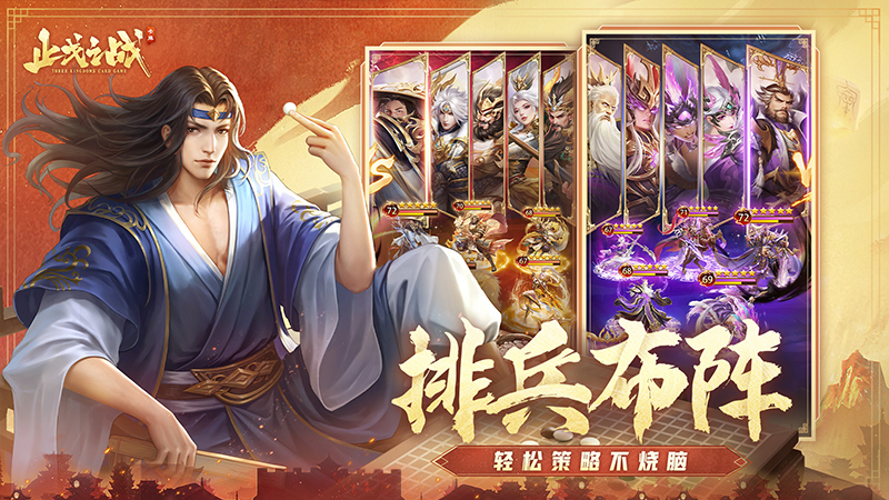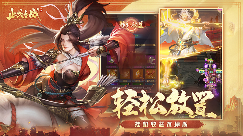 止戈之战是一款以三国时期为背景的放置卡牌策略手游,带领玩家穿越到那段英雄辈出、群英争霸的乱世岁月。在这片土地上,您可以收集各路名将名美女人,体验丰富的战略排阵与布局乐趣,同时享受轻松挂机带来的快速成长快感。游戏采用先进的引擎技术,真实还原三国地貌风貌,还原冷兵器时代的激烈争夺,战场天气多变无常,阵型与兵种相互制衡,令您沉浸于最原汁原味的三国战场体验中。十连抽必出五星武将的贴心设计,加上所有资源可免费获得的设定,让不充钱的玩家也能轻松游玩,畅快体验全场。